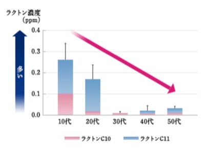 2017年にロート製薬が発表したデータでは、ラクトン由来の甘い香りは10代後半が最も強く、その後30代にかけて目立って弱まり、35歳前後までゆるやかに低下していく傾向が示されました。